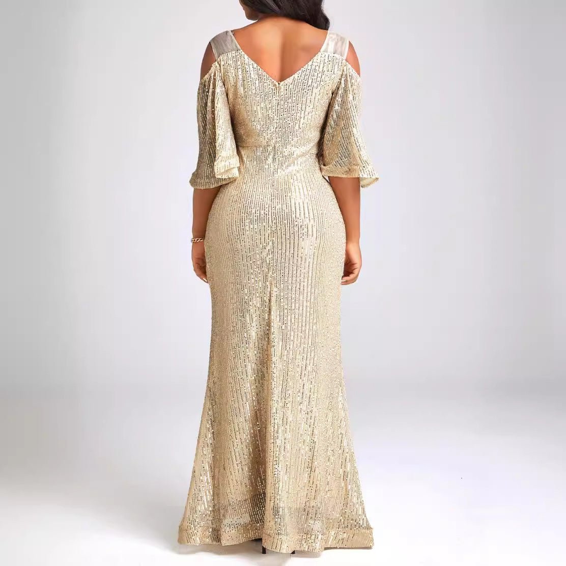 Festklänningar – Guldig Klänning med Paljetter och Öppna Axlar