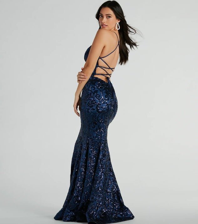 Festklänningar – Lång Mörkblå Paljettklänning med Spetsmönster