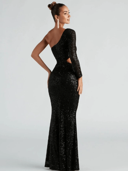 Glittrande långklänning med en axel och elegant utskärning vid midjan. Figurnära passform som framhäver siluetten – perfekt för fest, gala eller speciella tillfällen. Finns i flera färger.