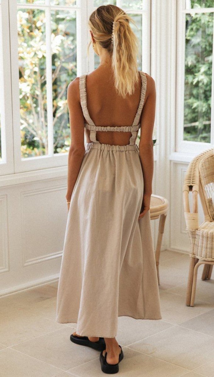 En elegant och avslappnad klänning med vackra rynkade axelband och en unik öppen ryggdesign. Tillverkad i ett mjukt, luftigt tyg som ger en naturlig siluett och bekväm passform. Perfekt för sommarens varma dagar, strandutflykter eller avslappnade middagar utomhus.